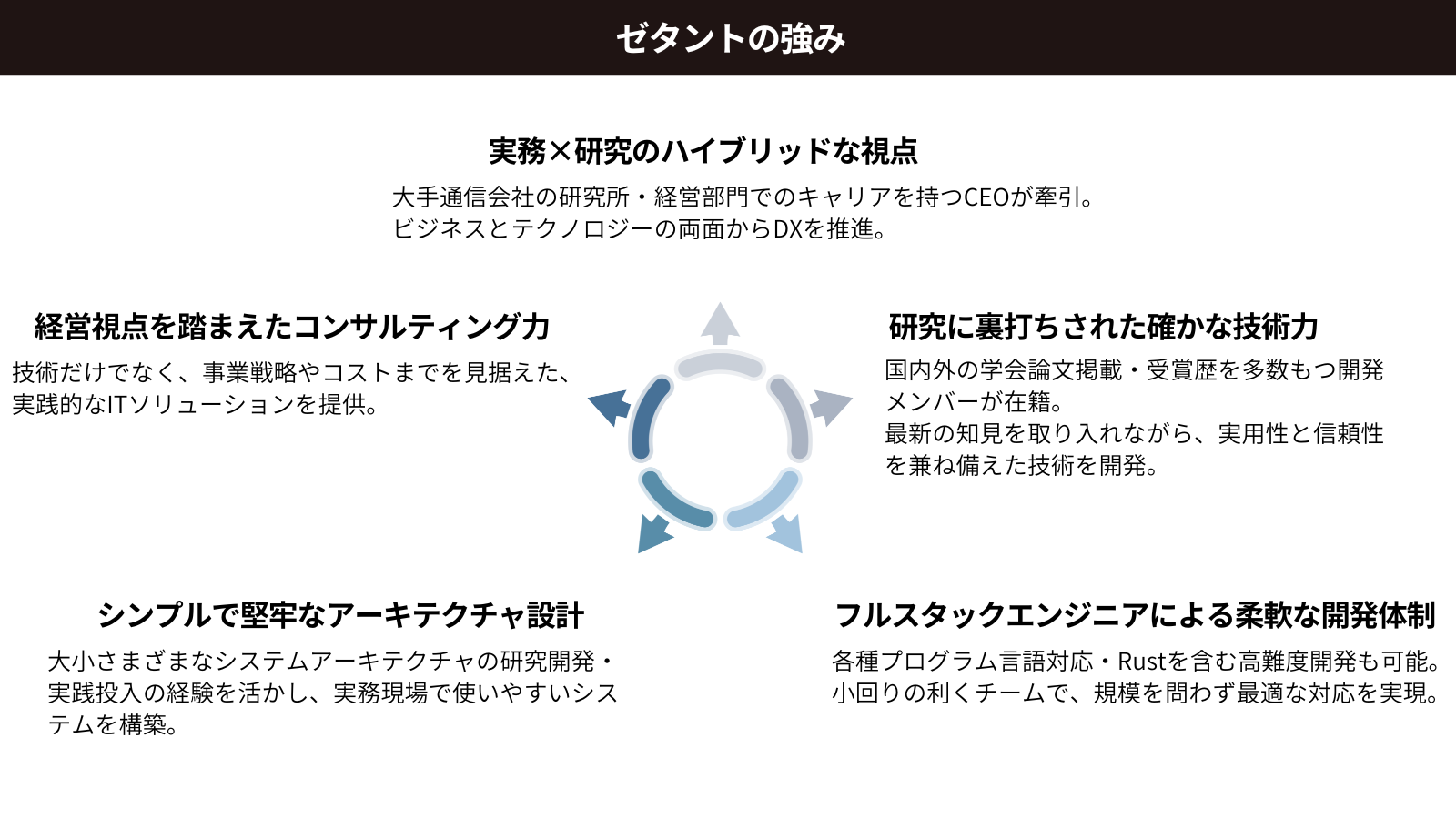 株式会社ゼタントは、Minimal Elements, Maximum Satisfaction.”を掲げ、通信技術や情報セキュリティ分野の実務や研究で培った確かな技術開発力と、経営視点のコンサルティング力を融合し、戦略から実装、定着までを伴走するテクノロジーパートナーです。誰もが「かんたん」に「安心して」利用できるサービスを開発・提供することで、中小企業のDX推進をトータルサポートします。